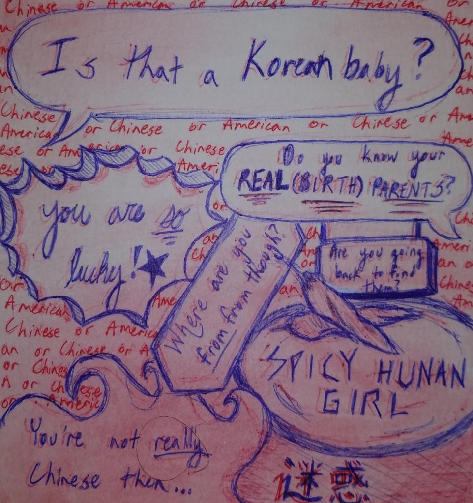 I created this piece to reflect on my adoption and what I wish I had been told when I was younger. I wanted to complicate the narrative of a smooth and idyllic interracial adoptive family. Although many children’s books around adoption normalize varying family structures, it is hard having two transnational adoptees come to live with an older single mother. Sharing my narrative is something I haven’t felt comfortable doing ever and having this outlet to express what I’ve been through and the struggles of my life as an adoptee was very therapeutic.